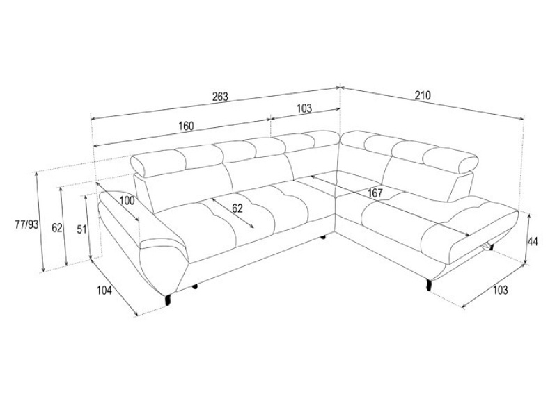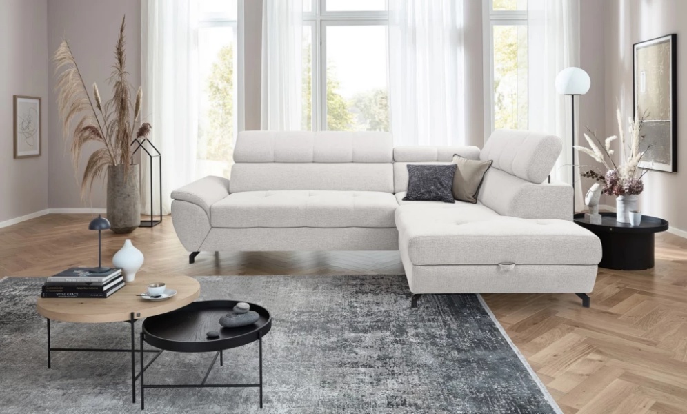 Coltar extensibil MARIO cu lada pentru depozitare, tetiere reglabile, personalizabil 263x210cm