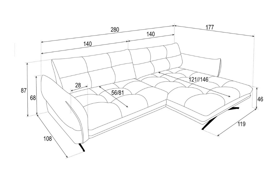 Lungime sezlong sezut: 121 / 146 cm