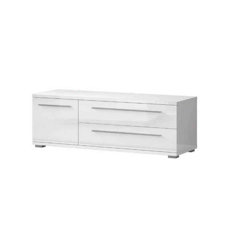 Comoda TV cu 1 usa si 2 sertare PIANO WHITE 135x46x45cm alb lucios, manere si picioare crom