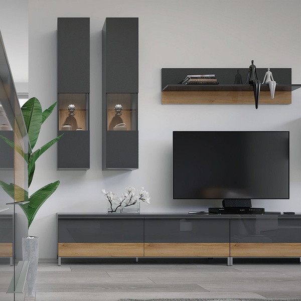 Comoda TV cu 2 sertare ONYX 152x46x45cm antracit lucios/ nuc Pacific, manere si picioare crom