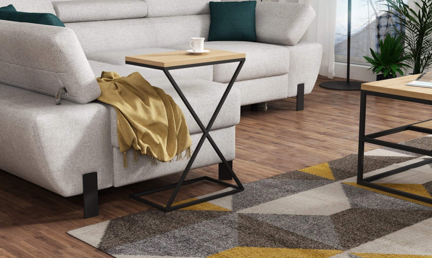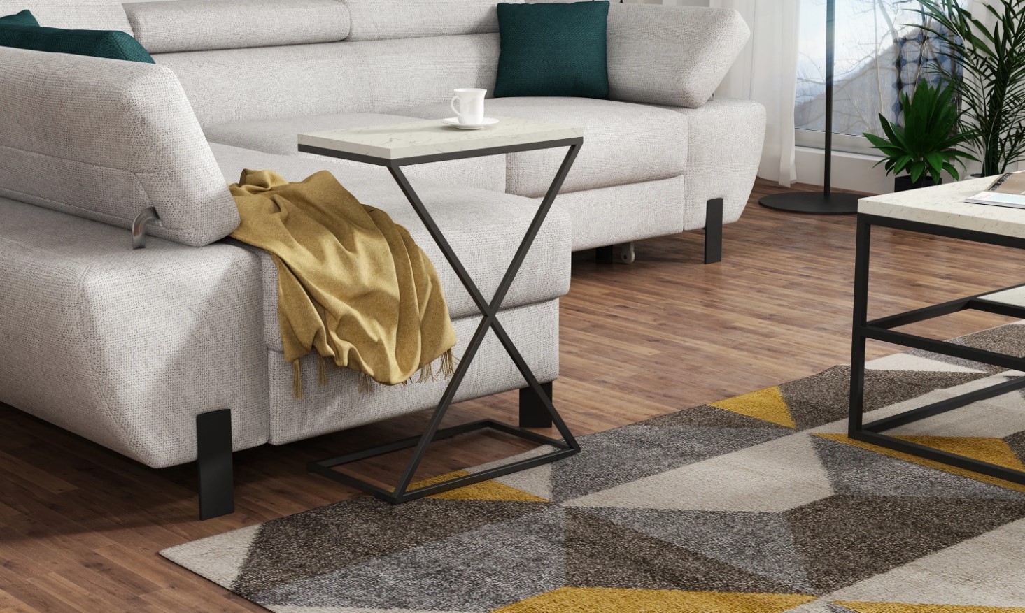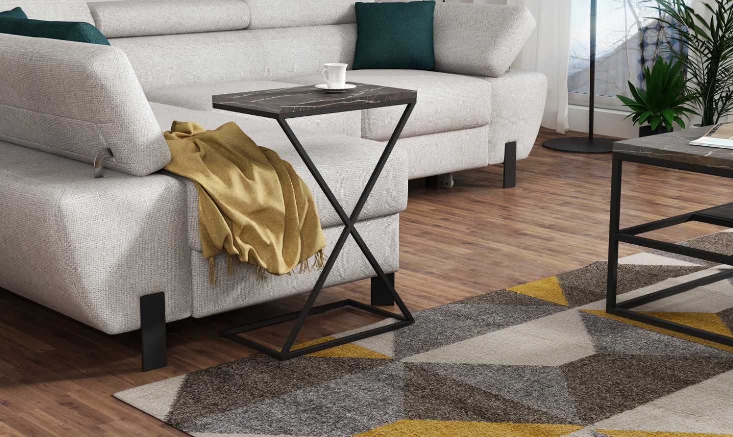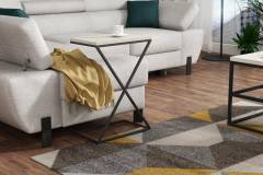 Masuta laterala DOTI este compacta si eleganta, perfecta pentru orice spatiu modern. Disponibila in nuante: Light Marble, Dark Marble, Grafit si Stejar Natural, cu blat din Pal Egger sau lemn de stejar si cadru metalic negru vopsit cu pulbere. Design practic si rafinat pentru casa ta!