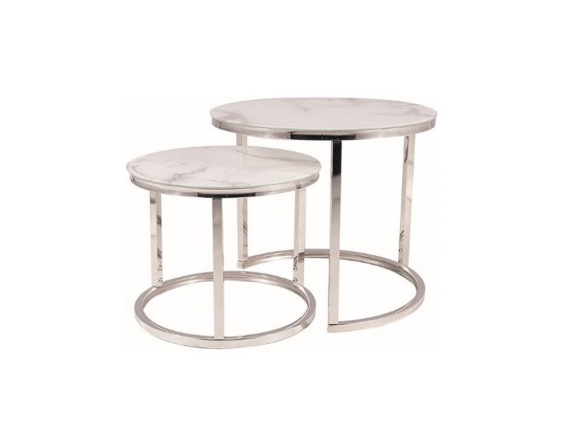 Set 2 masute ATLANTA B II din sticla cu efect de marmura alba, metal crom 53xH45cm / 43xH35cm
