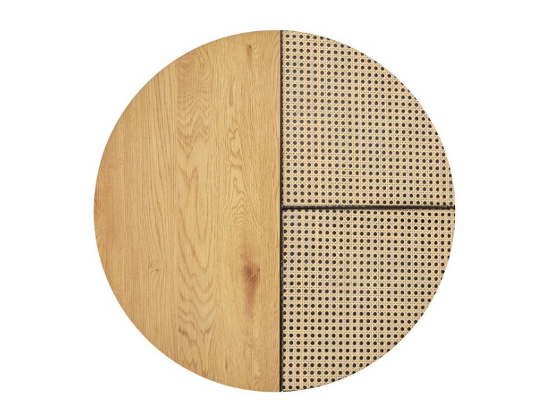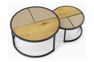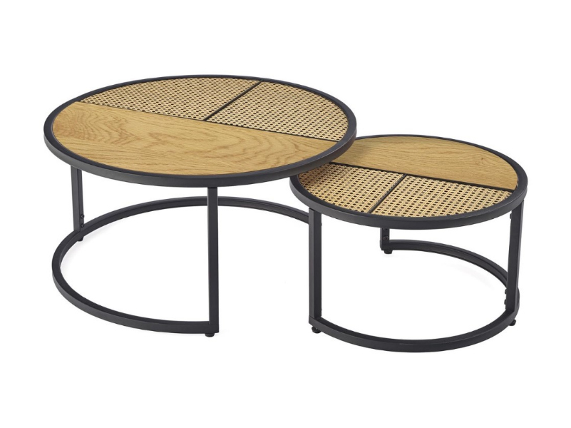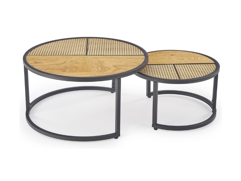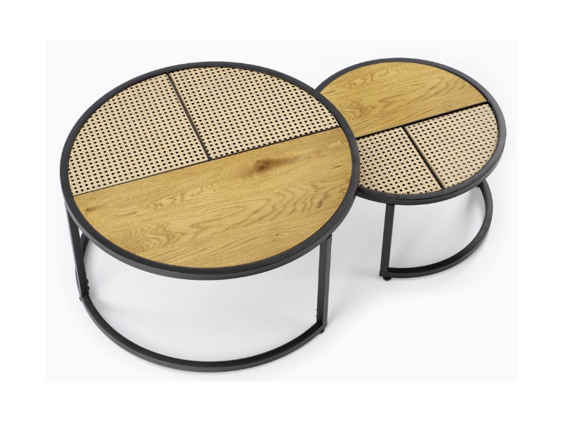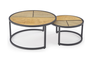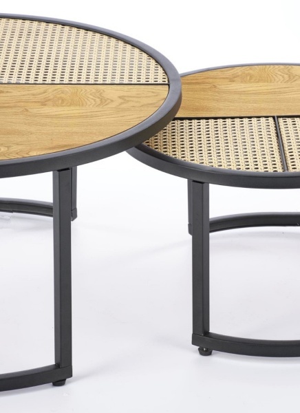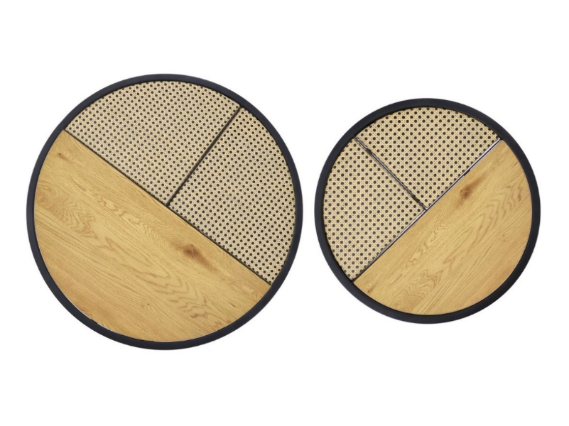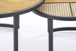 Set 2 masute GARMINA din MDF furniruit si rattan sintetic stejar, metal negru 50xH38cm / 70xH36cm