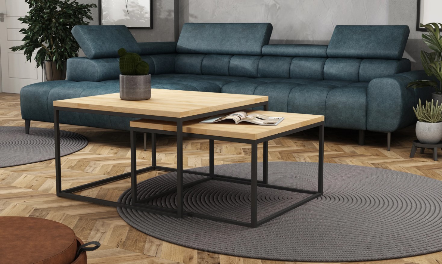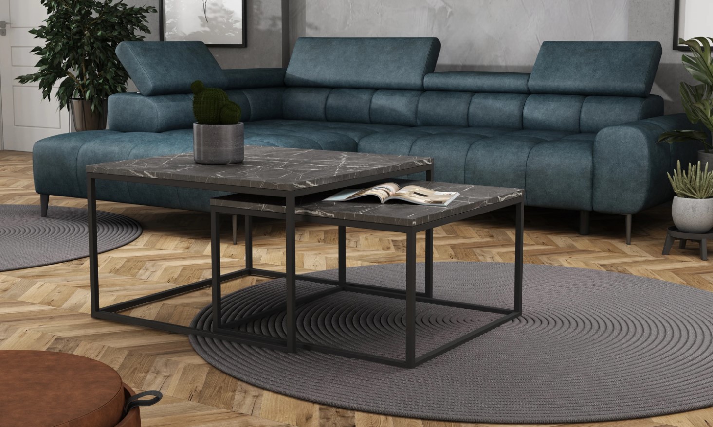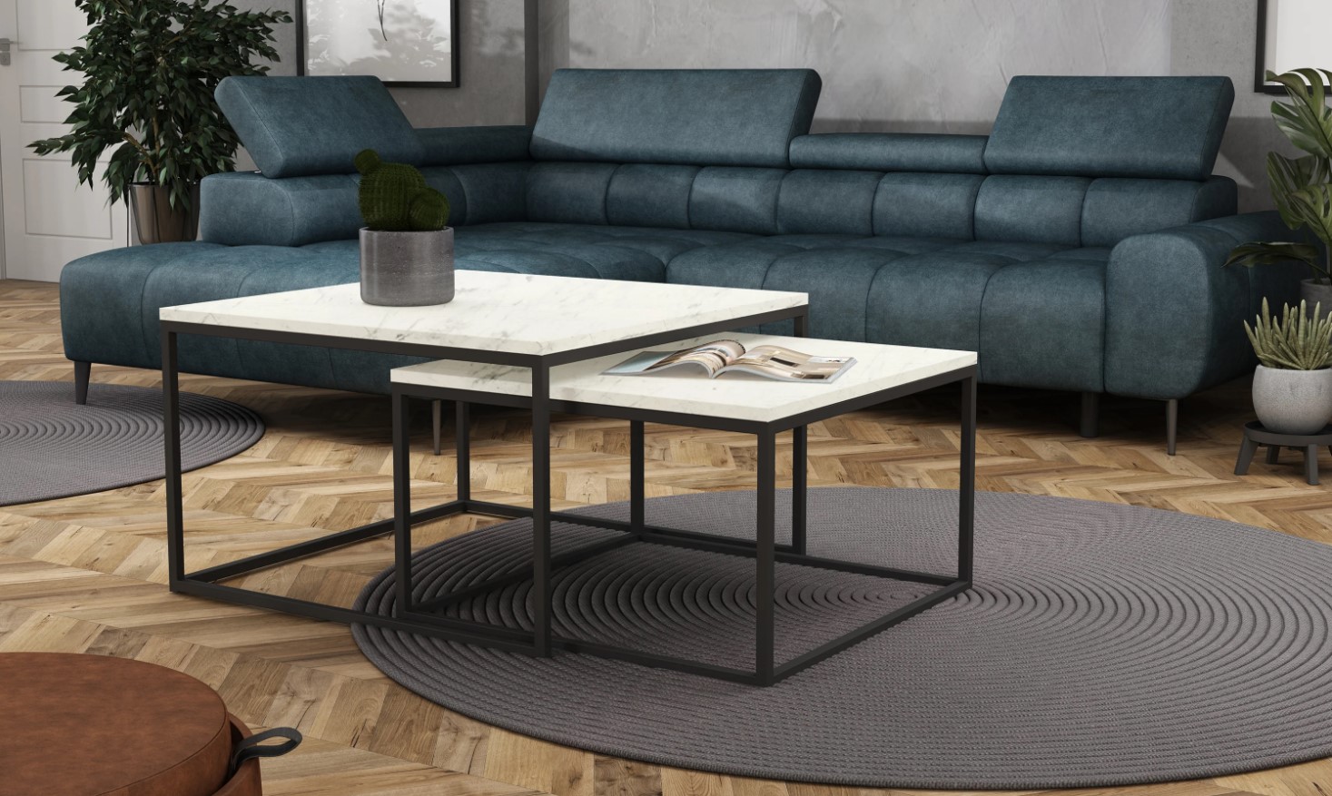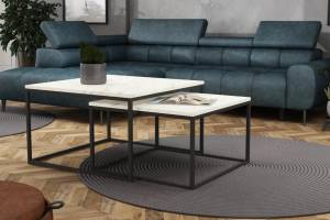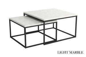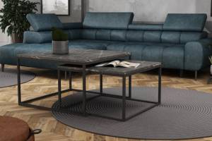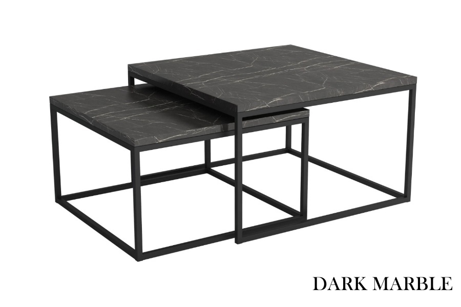 Setul de 2 masute GINO imbina stilul modern cu functionalitatea. Disponibile in nuante: Light Marble, Dark Marble, Grafit si Stejar Natural. Blaturi din Pal Egger sau lemn de stejar, sustinute de cadre metalice vopsite negru cu pulbere. Perfecte pentru interioare elegante si practice!
