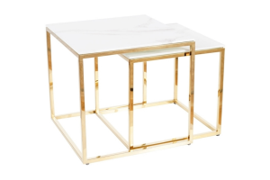 Set 2 masute GLORIA din sticla cu efect de marmura alba, metal auriu 45x45xH43cm / 40x40xH38cm