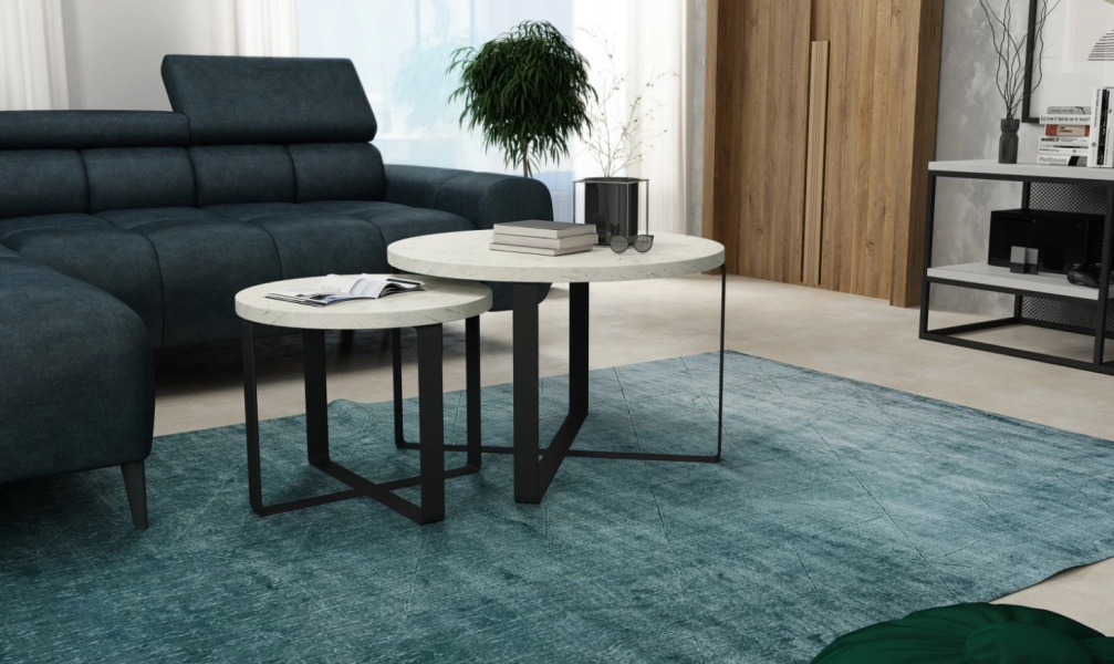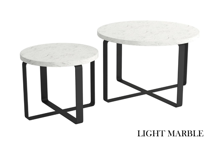 Setul de 2 masute KODO aduce eleganta si functionalitate in casa ta. Disponibile in nuante: Light Marble, Dark Marble, Grafit si Stejar Natural, cu blat din Pal Egger sau lemn de stejar si cadru metalic de 20mm, vopsit negru cu pulbere. Ideal pentru interioare moderne si versatile!