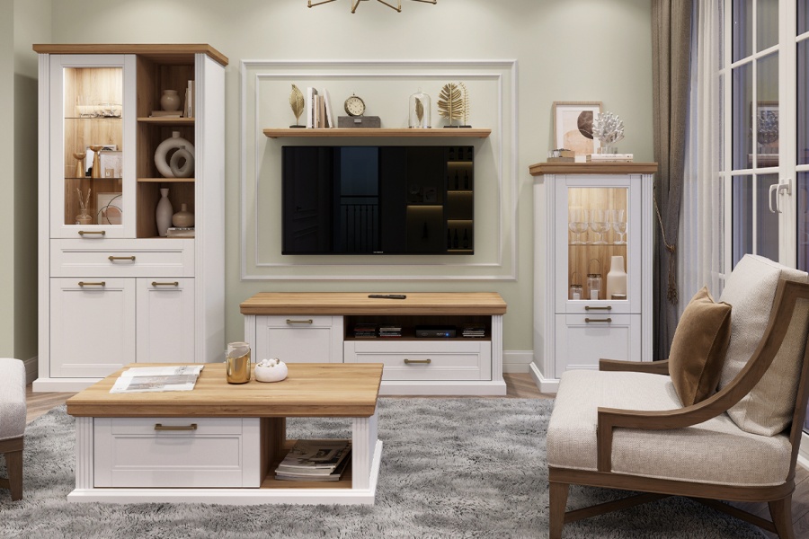 Colectia de living TARA WHITE impresioneaza prin designul clasic si detalii rafinate. Cu nuanta alb mat pentru fronturi si laterale, completata de Nuc Pacific pe blat si interior, margini liniare in relief si manere din metal aceasta colectie adauga eleganta si functionalitate, fiind dotata cu sistem de inchidere soft-close.