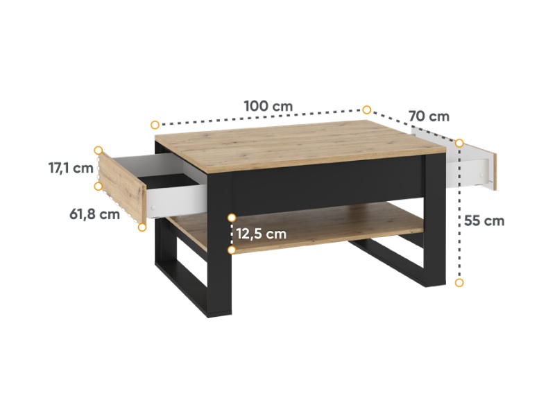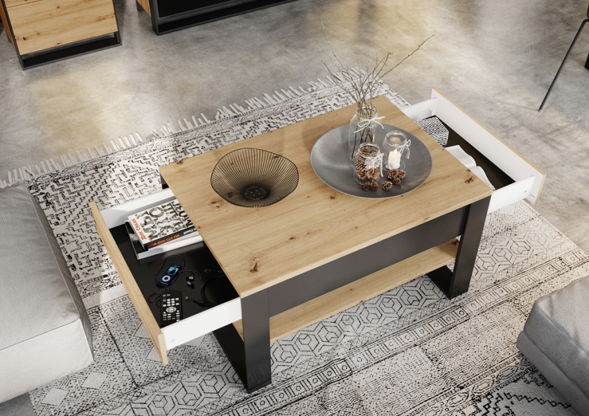 - masuta de cafea are 2 sertare pentru depozittare si o polita in partea de jos la spatiul deschis