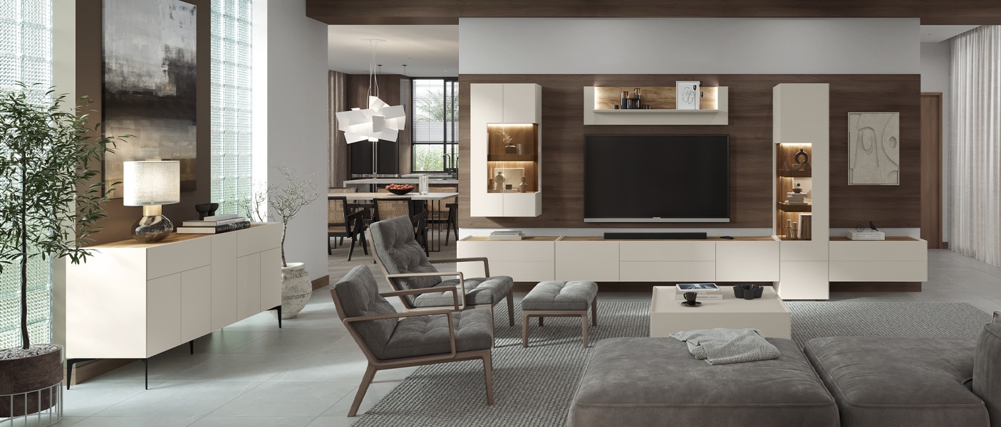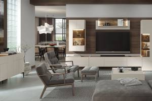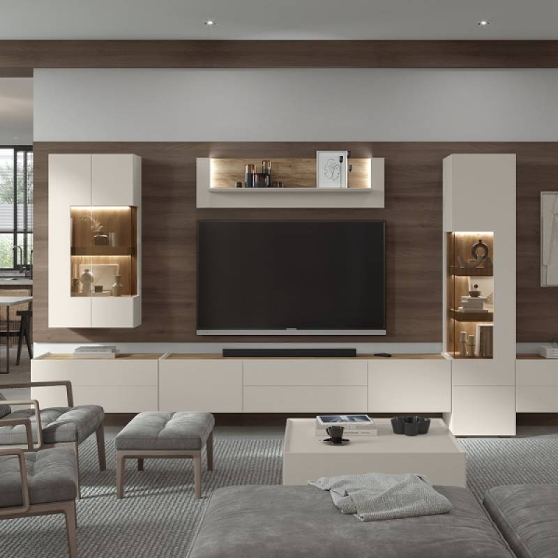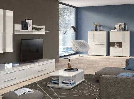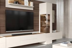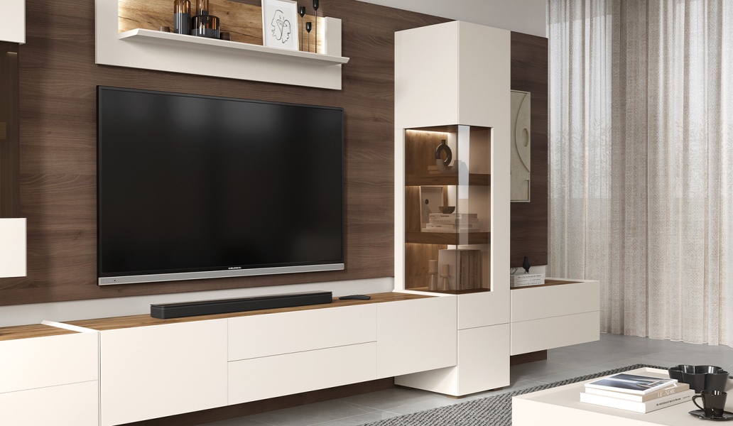 Pretul afisat nu include comoda din lateral, masuta, panoul de pe perete, montajul, alte piese de mobilier si accesoriile din imaginea de prezentare a produsului.