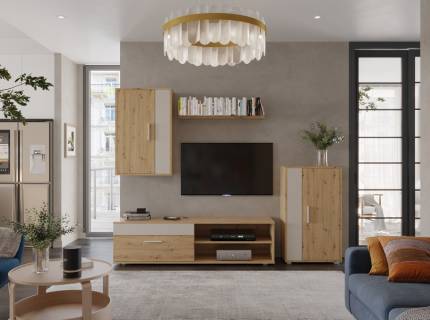 Pretul afisat nu include polita suspendata, comodele tv,comoda din lateral, masuta, montajul, alte piese de mobilier si accesoriile din imaginea de prezentare a produsului.
