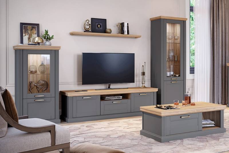 Colectia de living TARA GREY combina eleganta clasica cu functionalitatea moderna. Finisaj grafit mat si Nuc Pacific, fronturi in relief cu margini liniare, manere metal si inchidere soft-close. Alege rafinamentul pentru un living sofisticat!