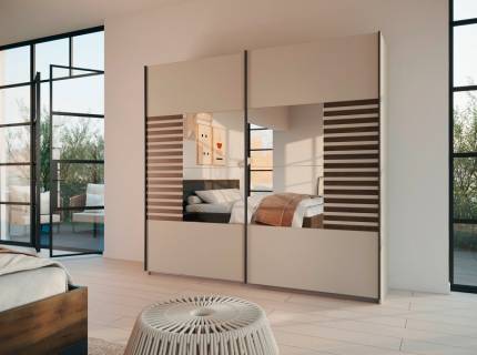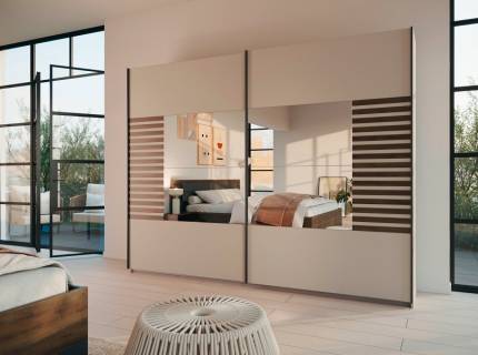 Dulap cu usi glisante BAREA 226x210x62cm champagne + stejar Atlantic dark - oglinda, maner gri metalic