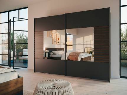 Dulap cu usi glisante BAREA 271x210x62cm gri metalic + stejar Atlantic dark - oglinda, maner gri metalic